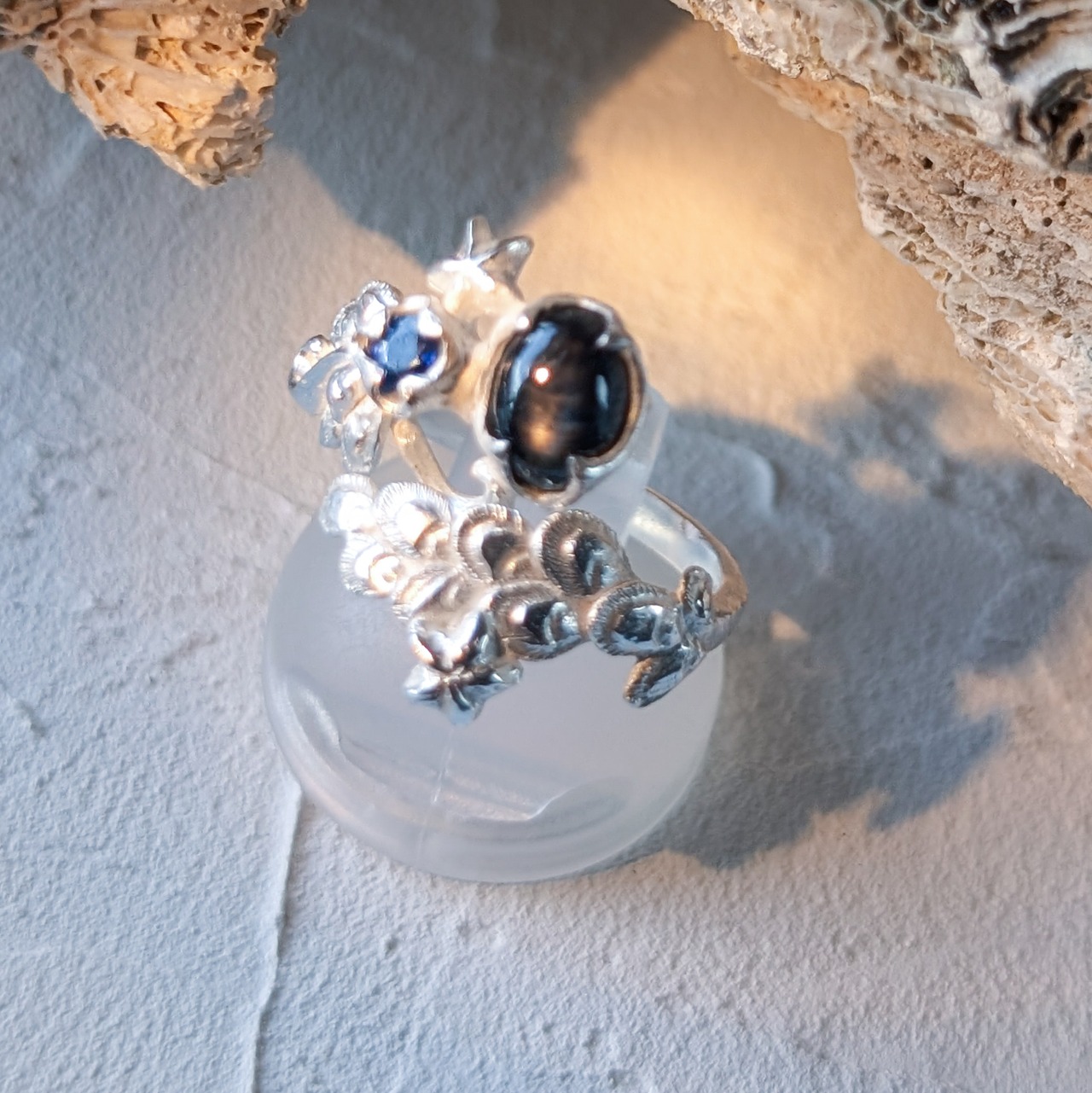 鱗には繊細な飾り彫りを施し、中央にスターサファイア、脇石にブルーサファイアを留めた指環。