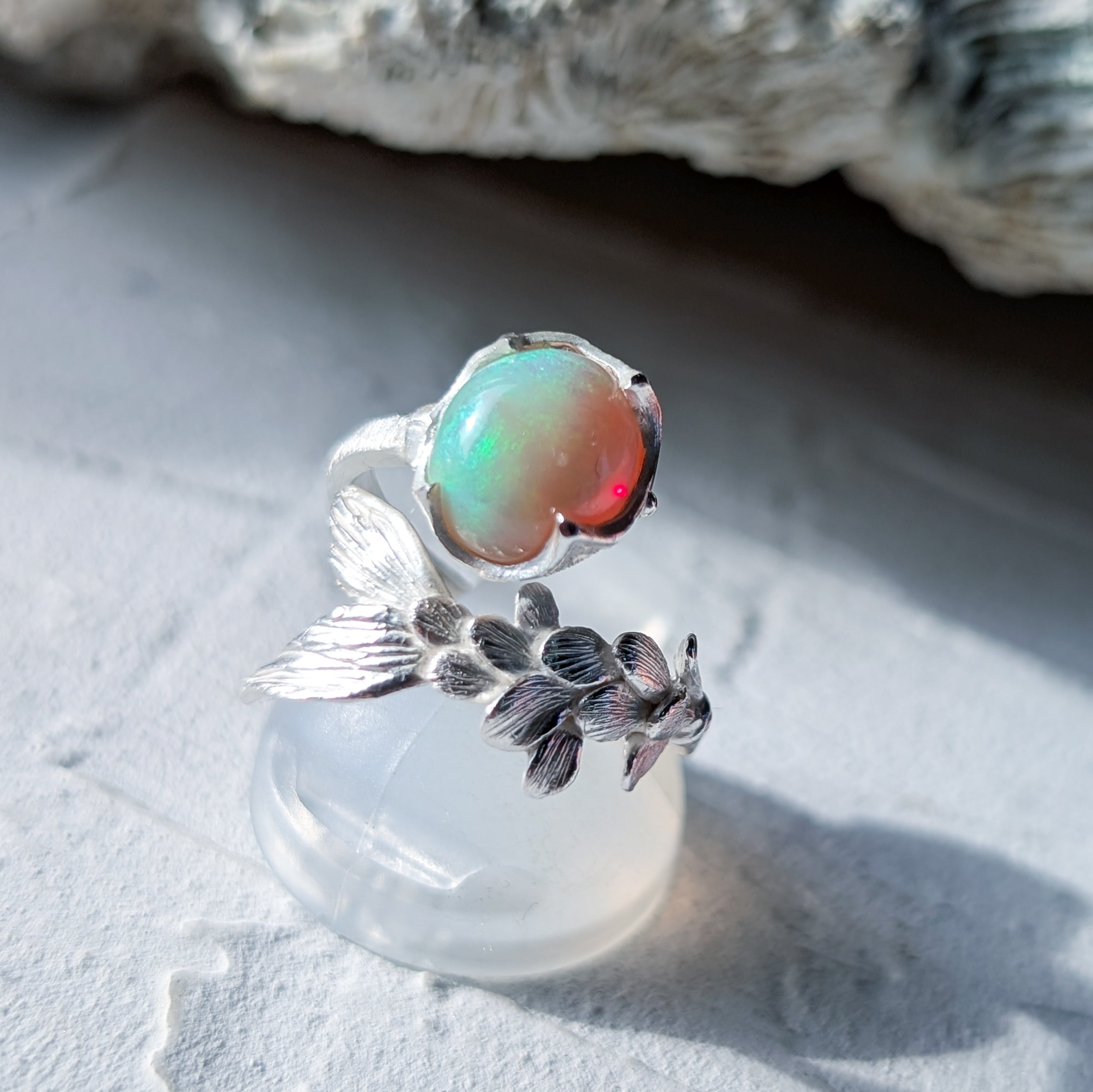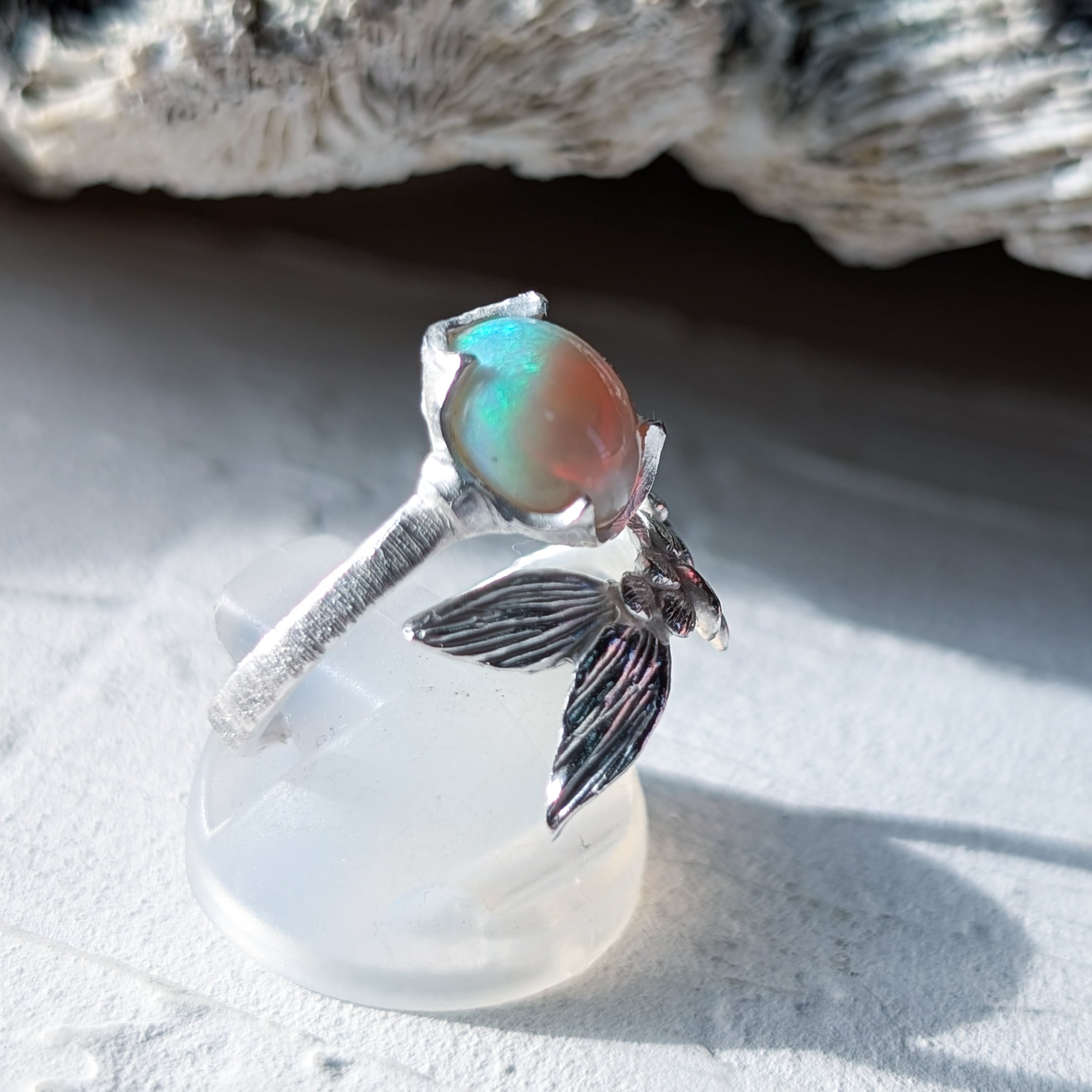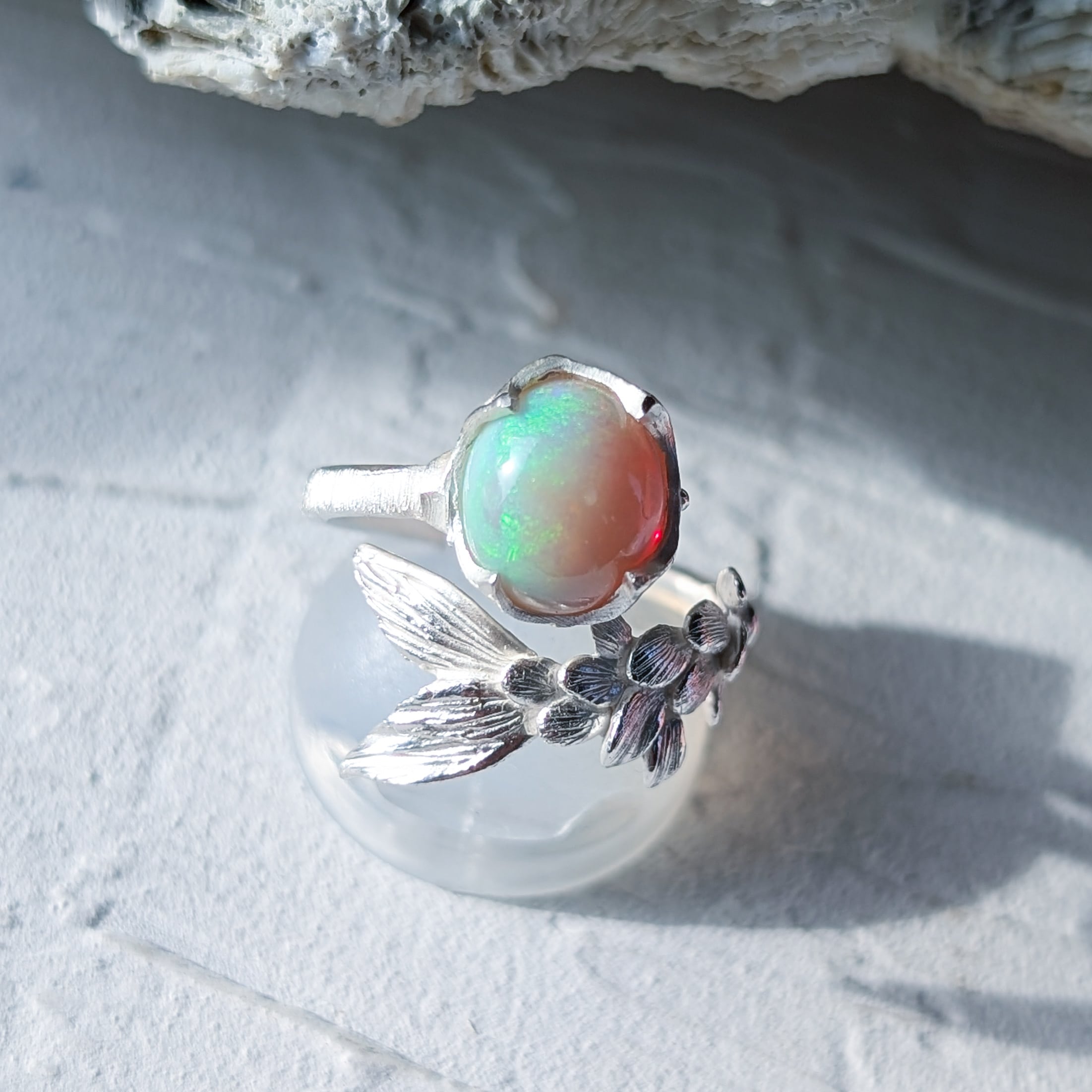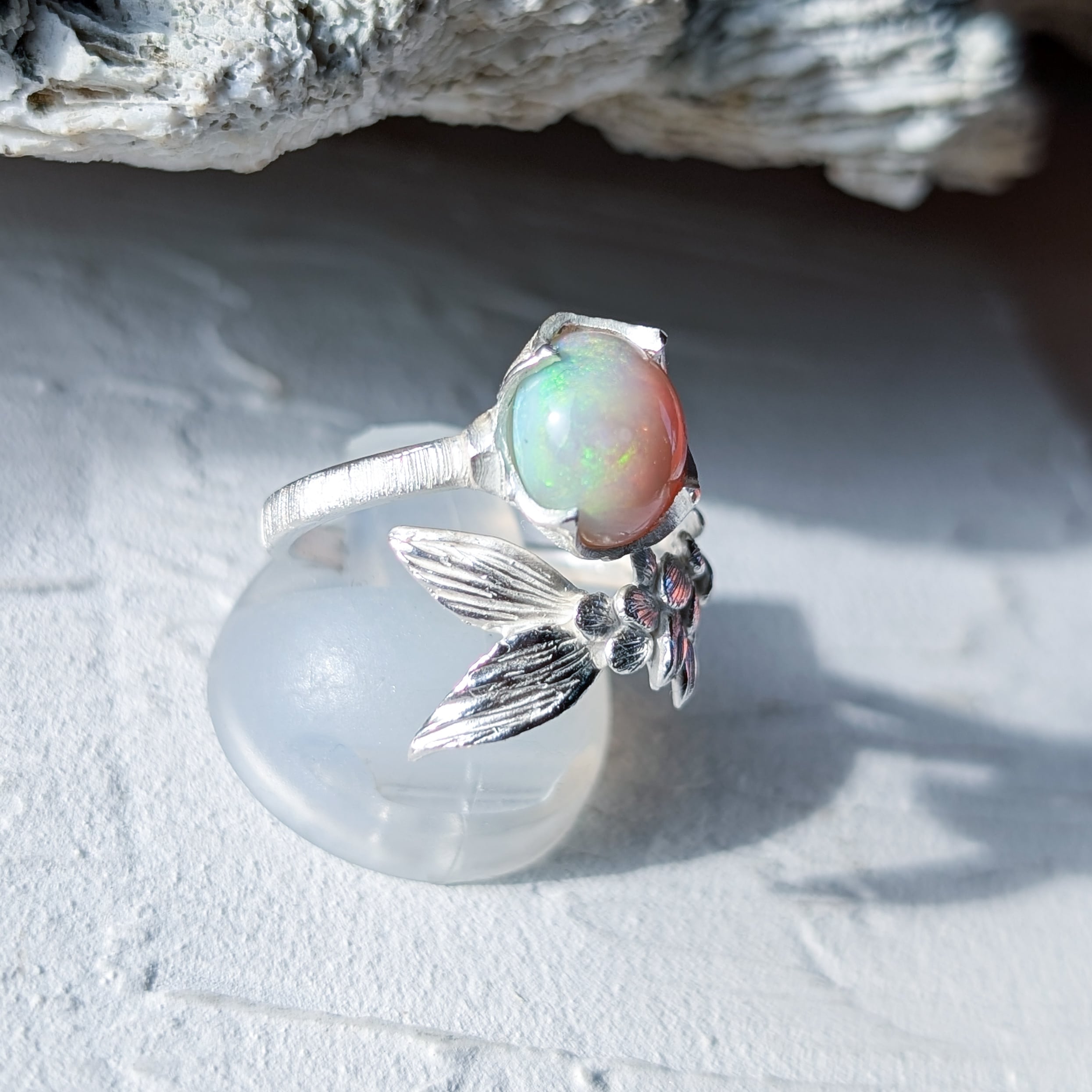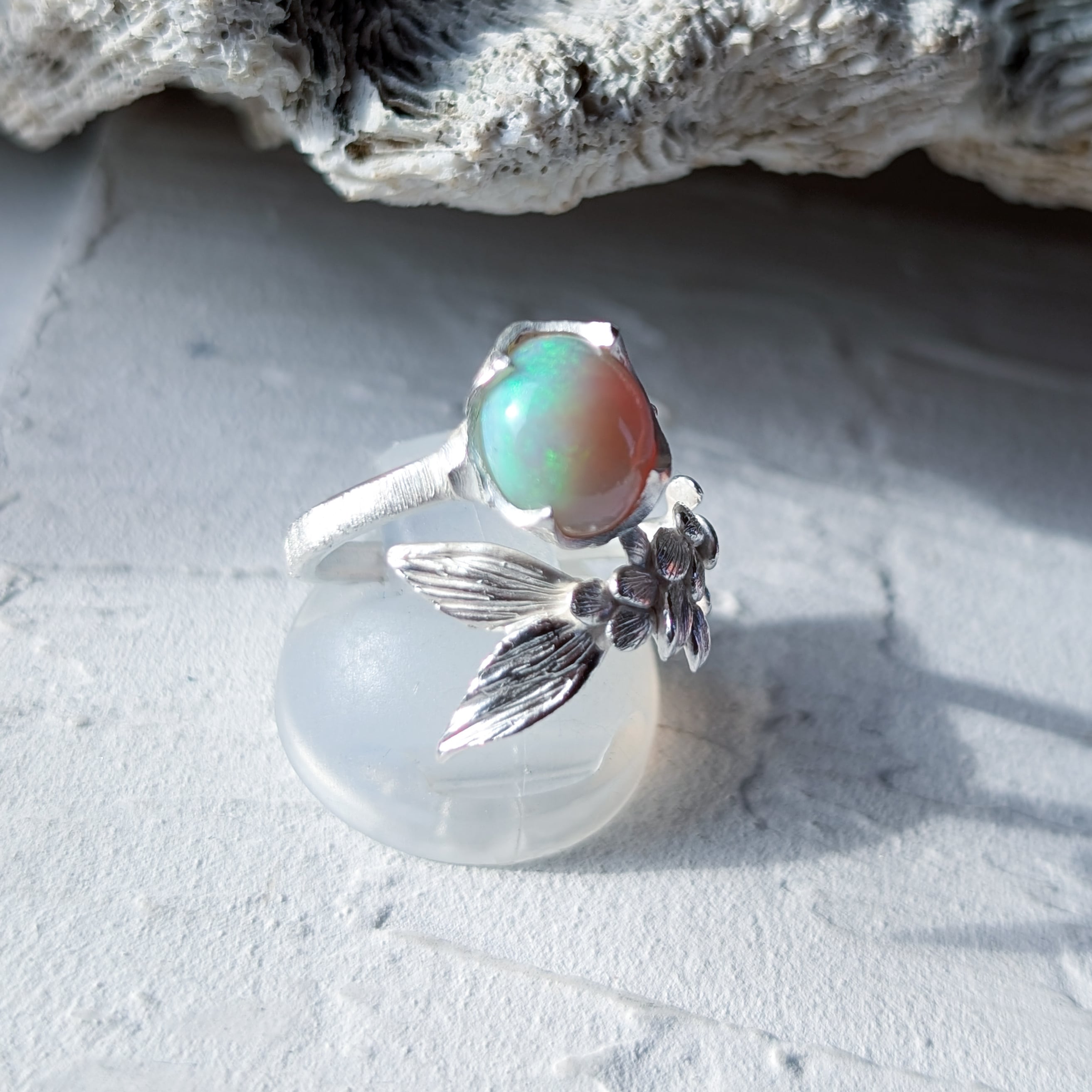 南の海を思わせるエメラルドグリーンの遊色を宿したホワイトオパールを留めました。