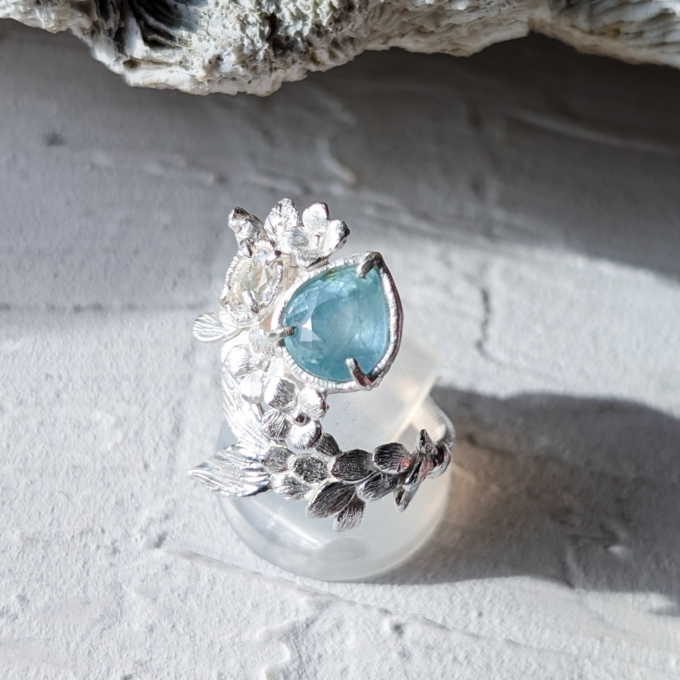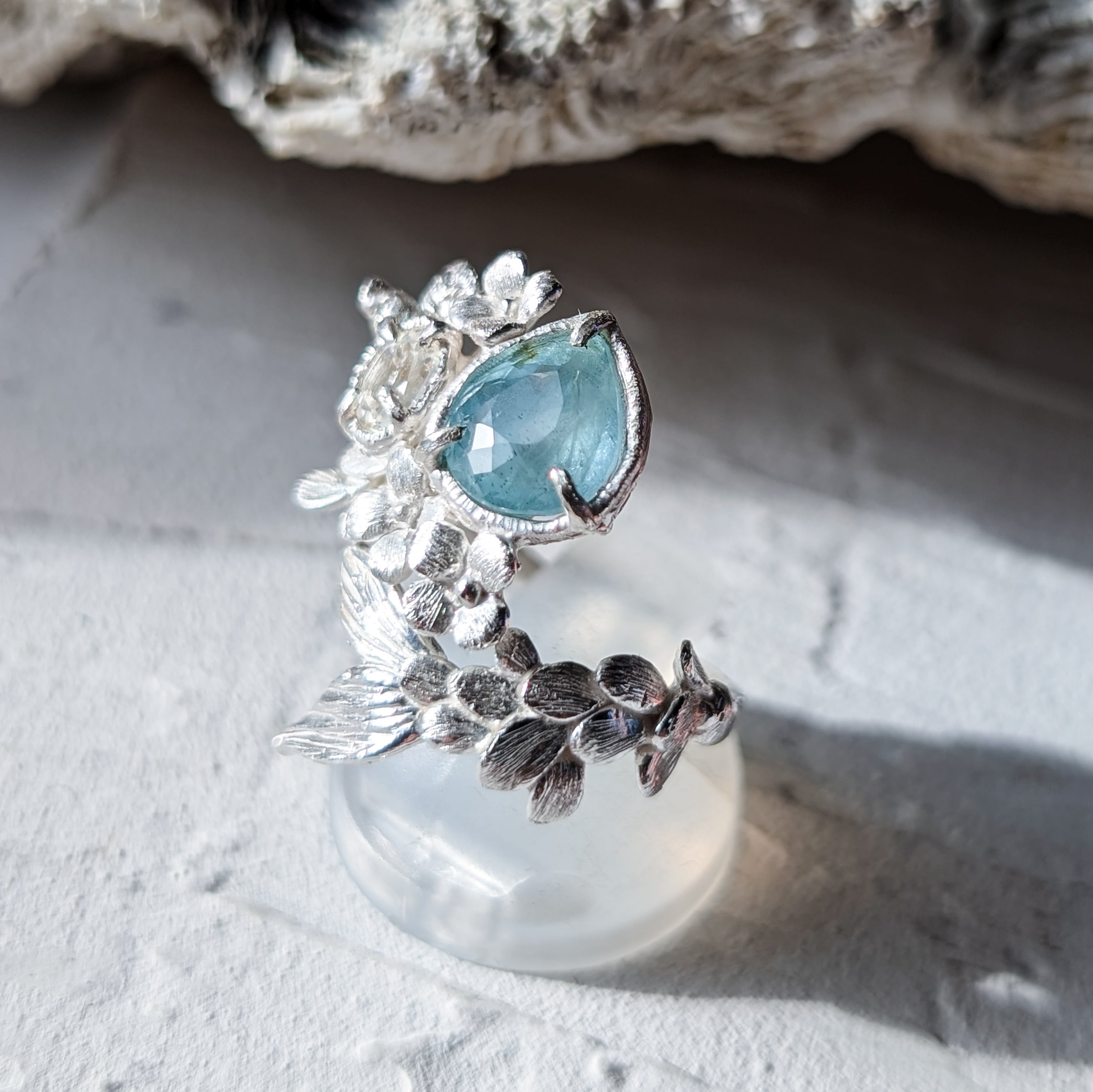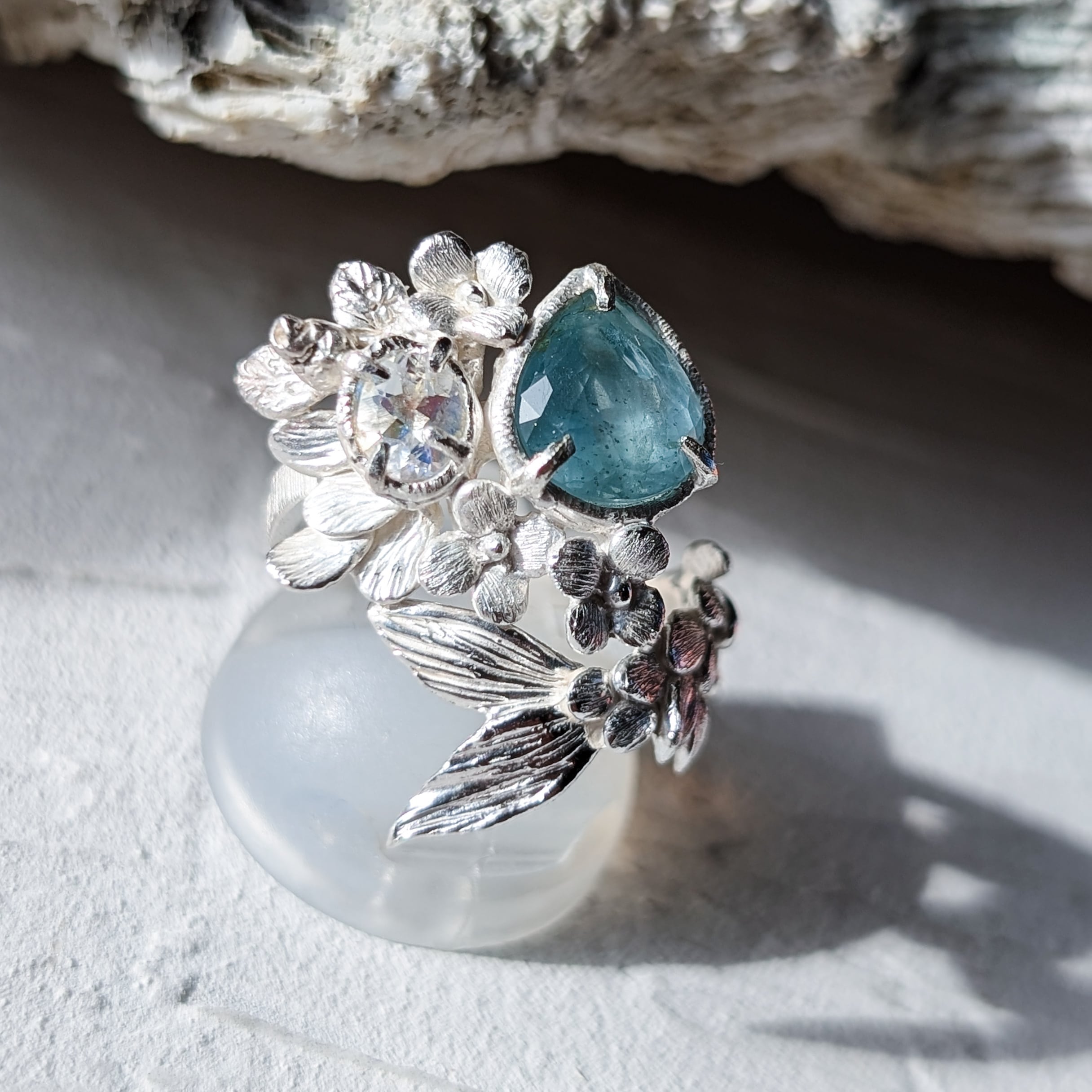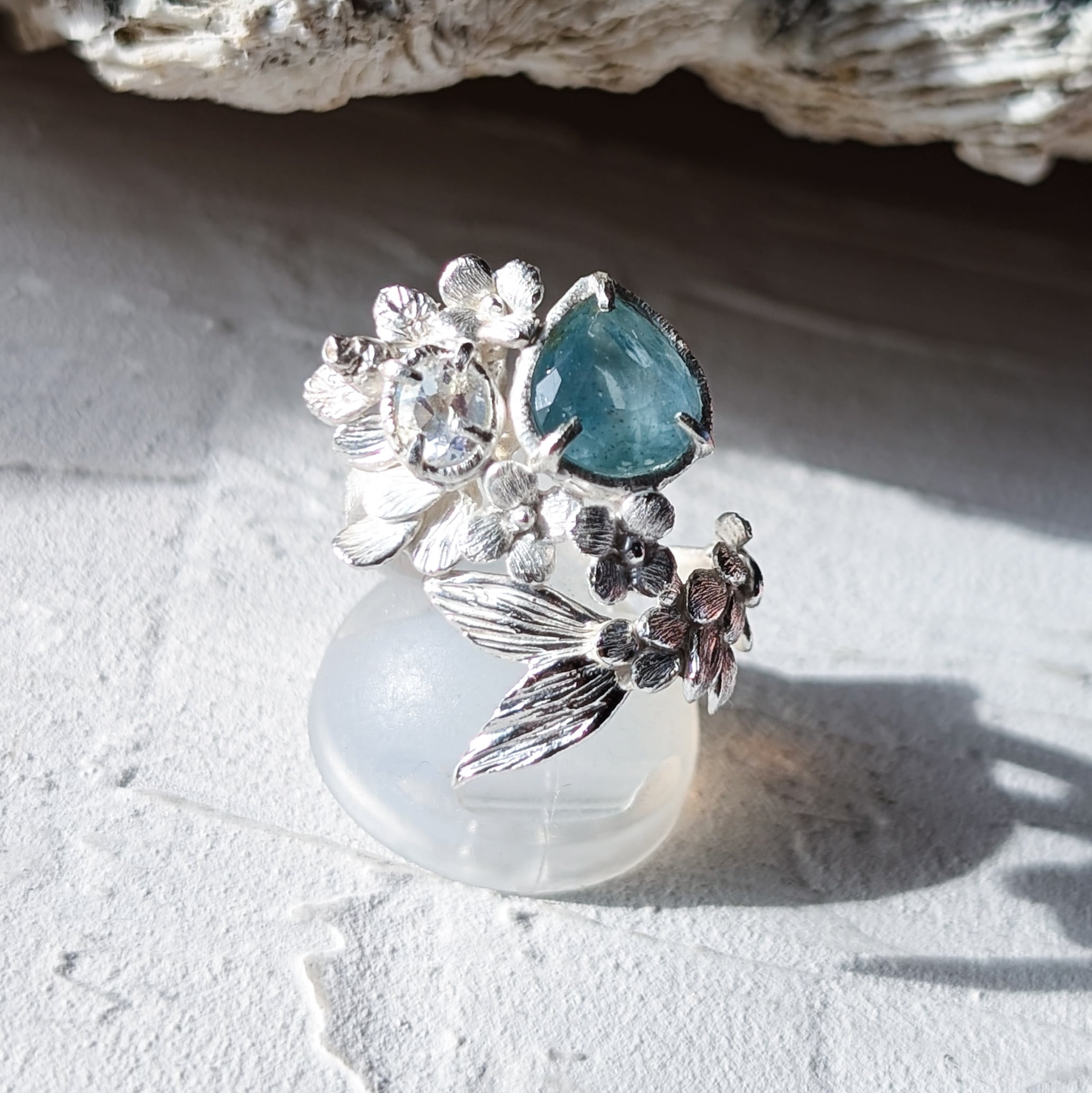 海を象徴するアクアマリンと、月の光のように静かに輝くアンデシンラブラドライトを留めました。