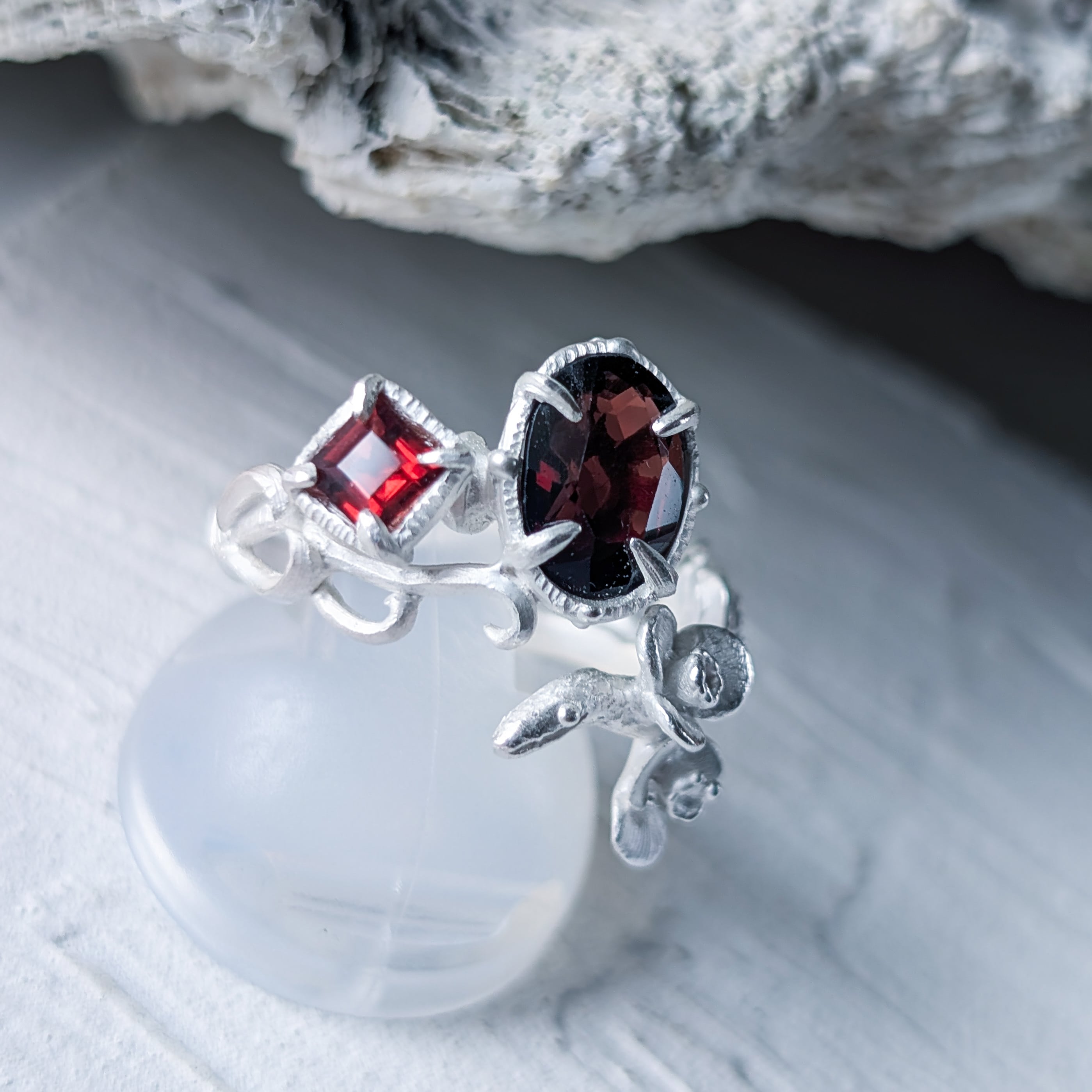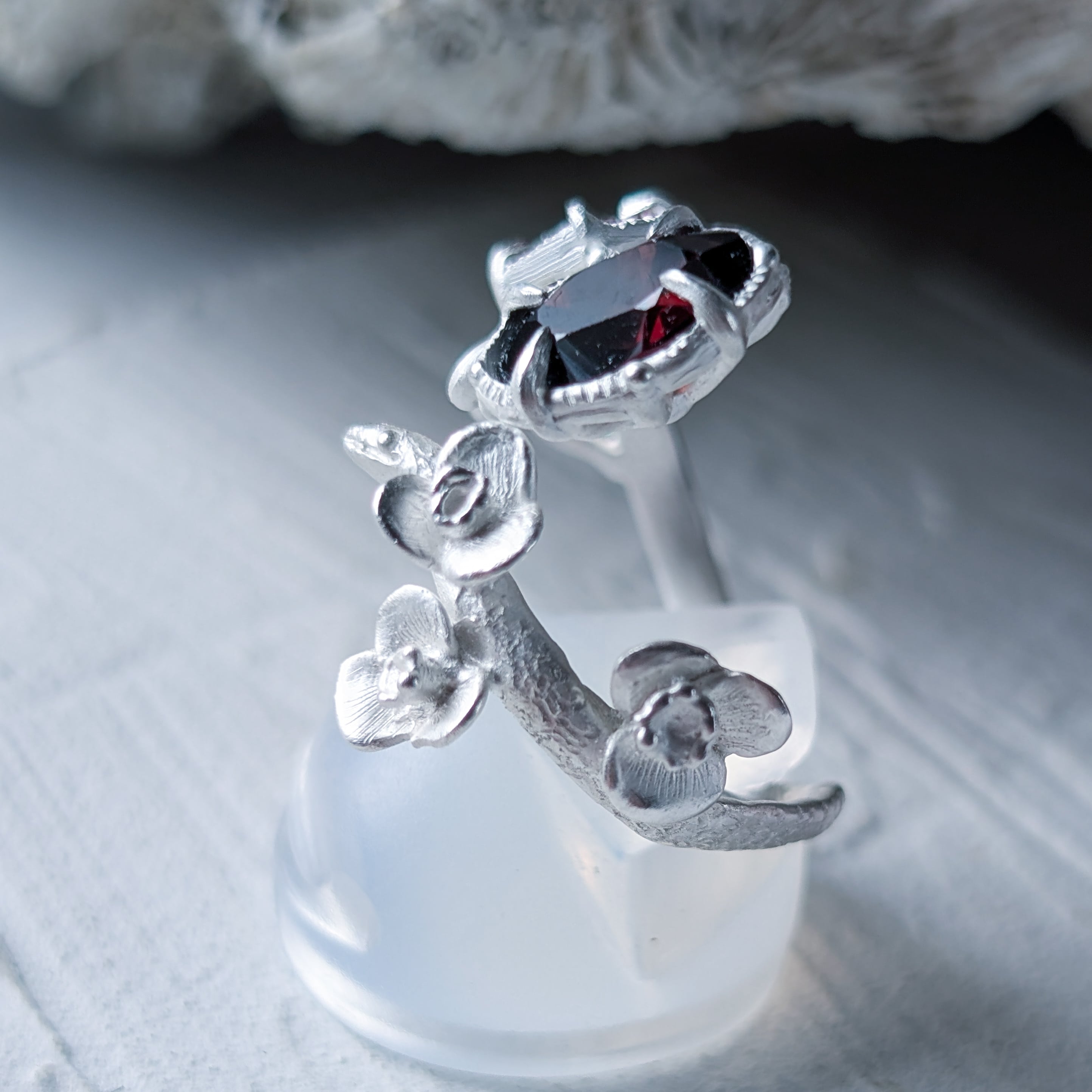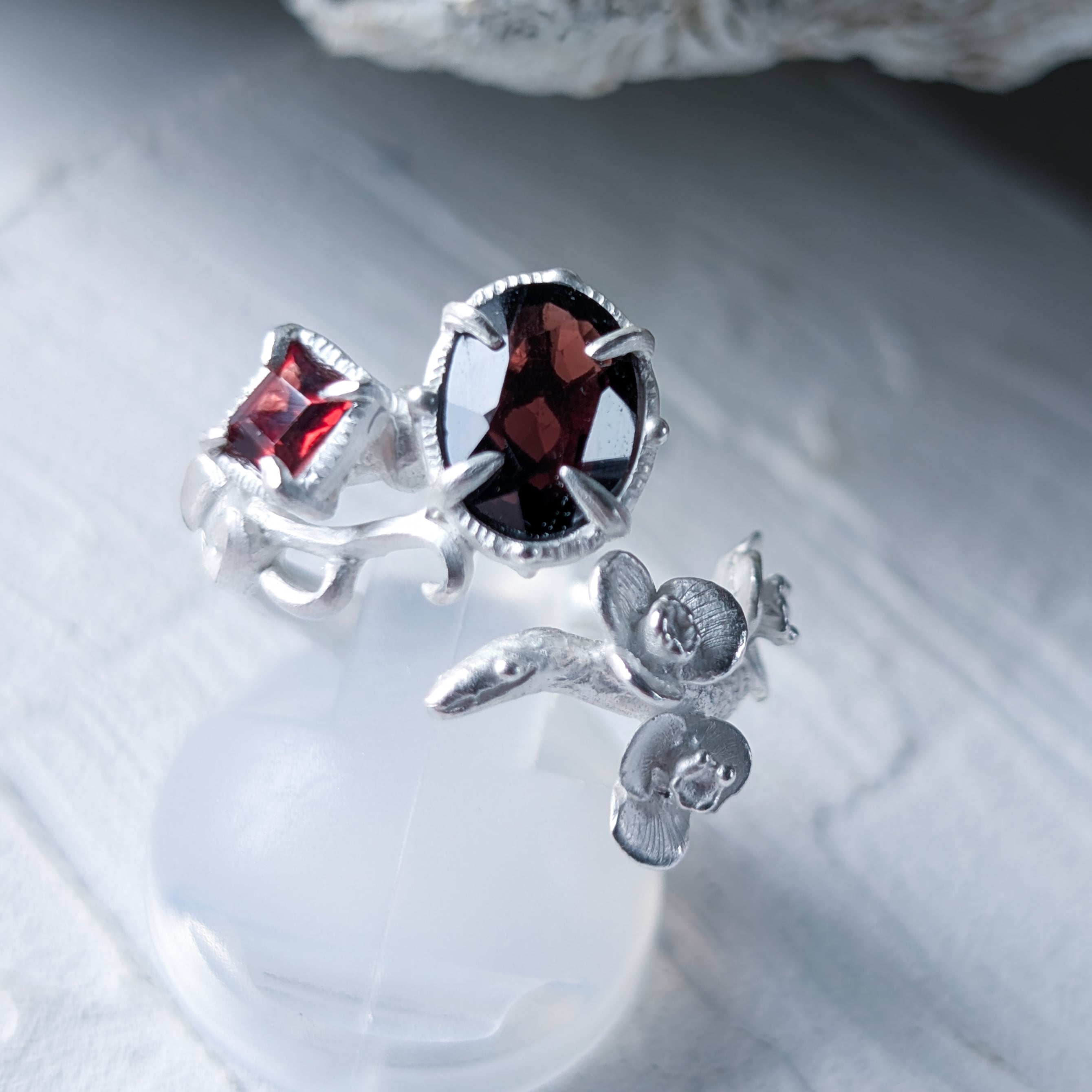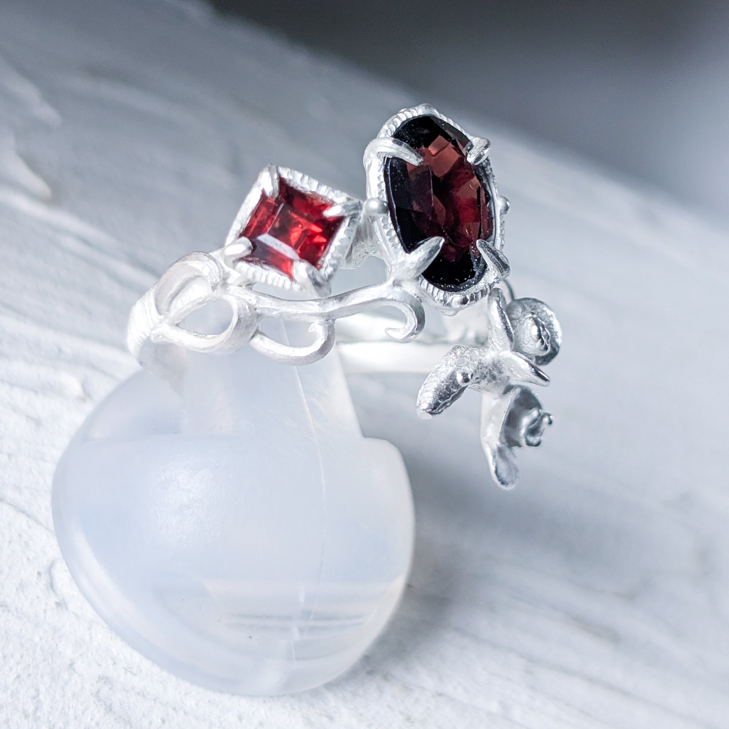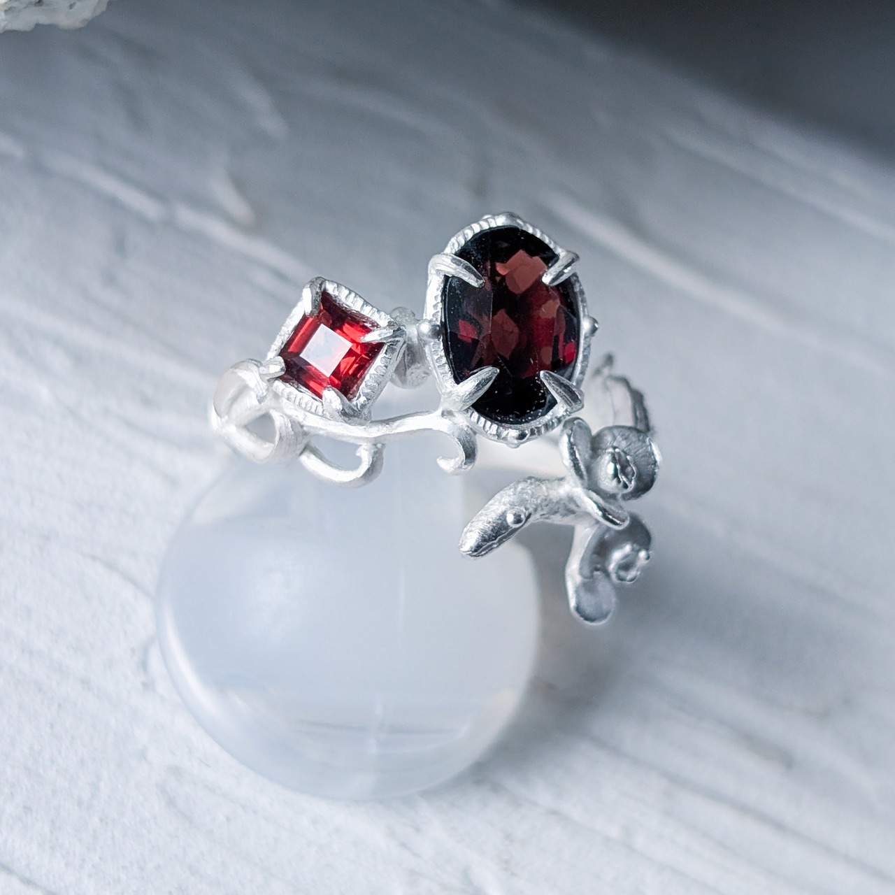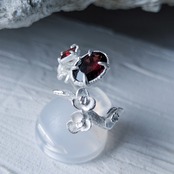 色の異なる二石のガーネットを留め、白蛇の身体からは椿が咲いている。