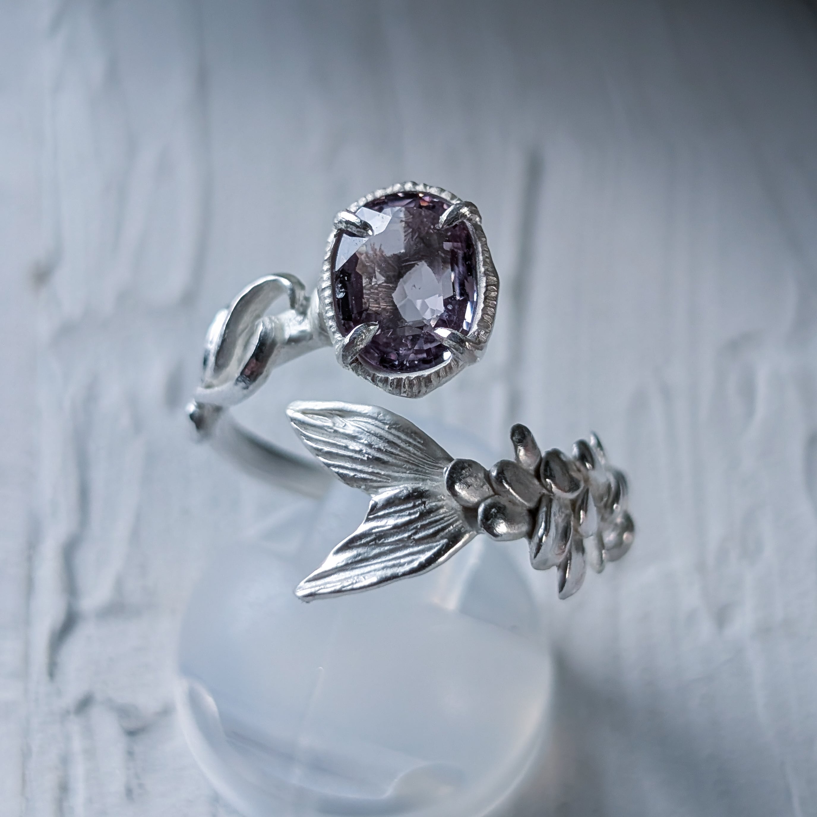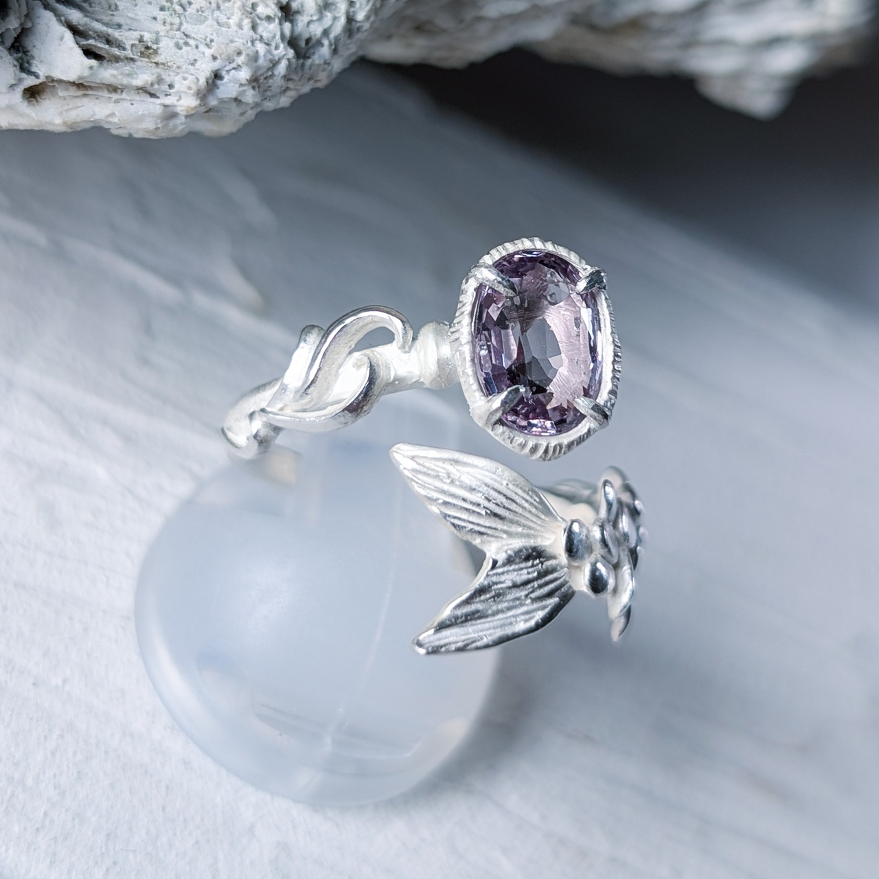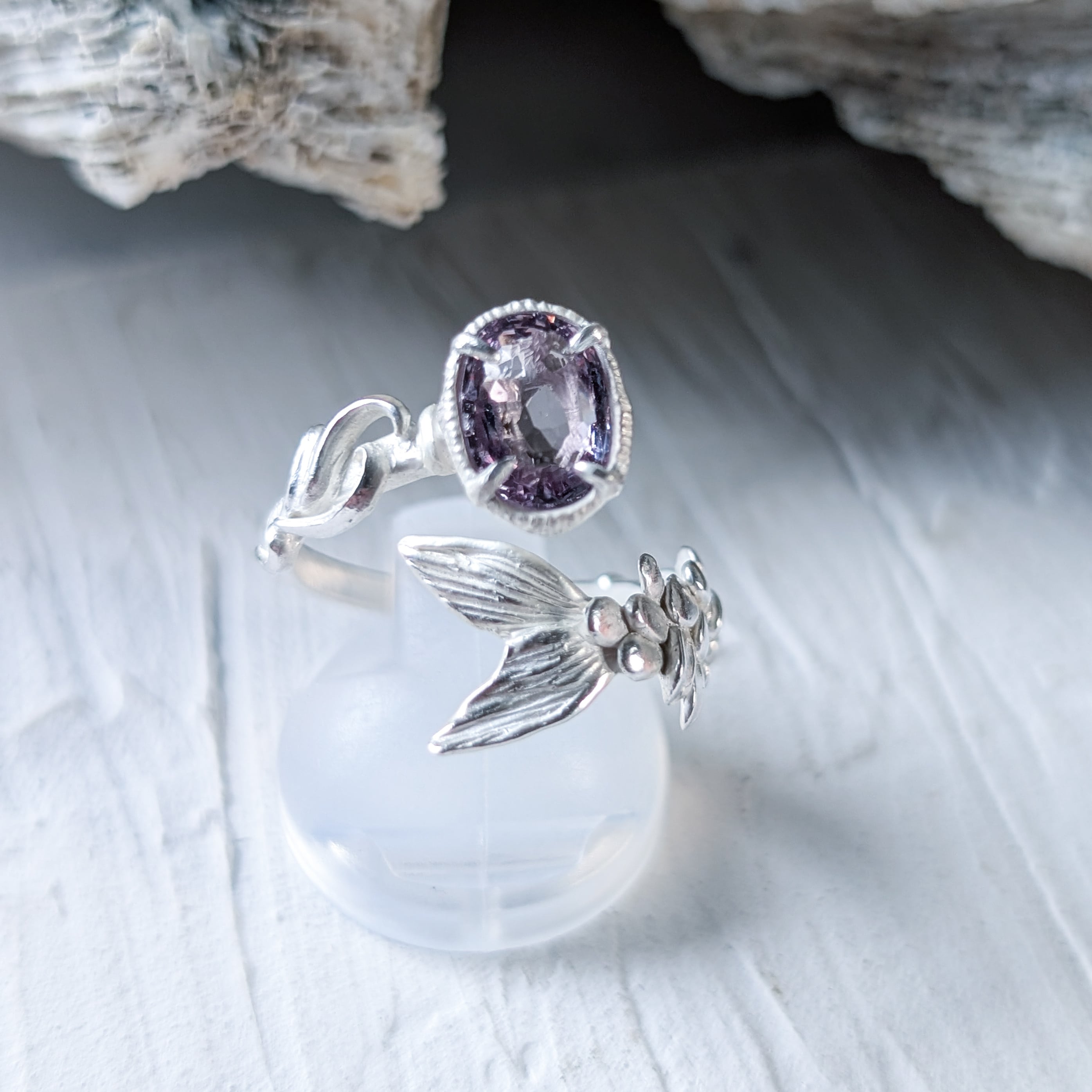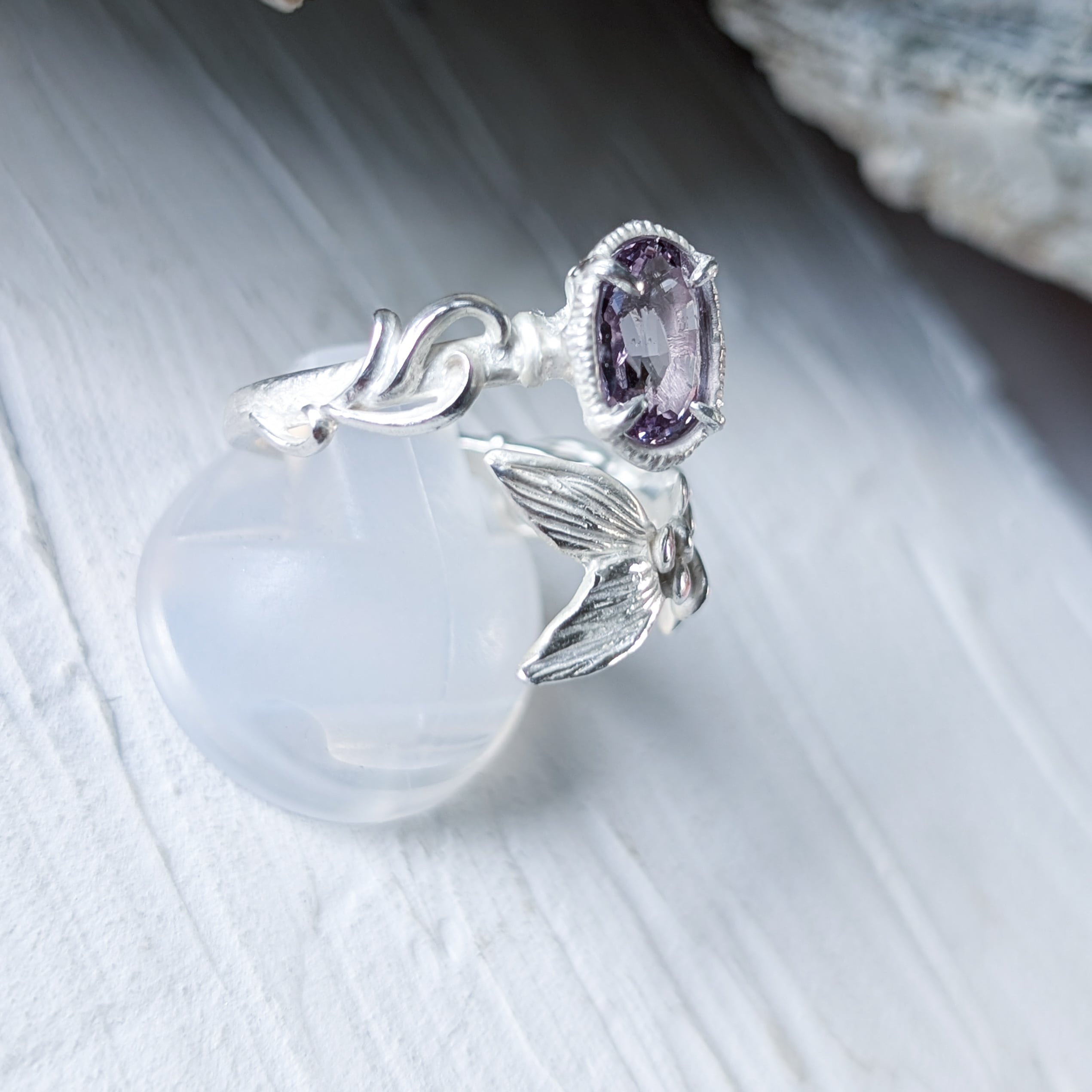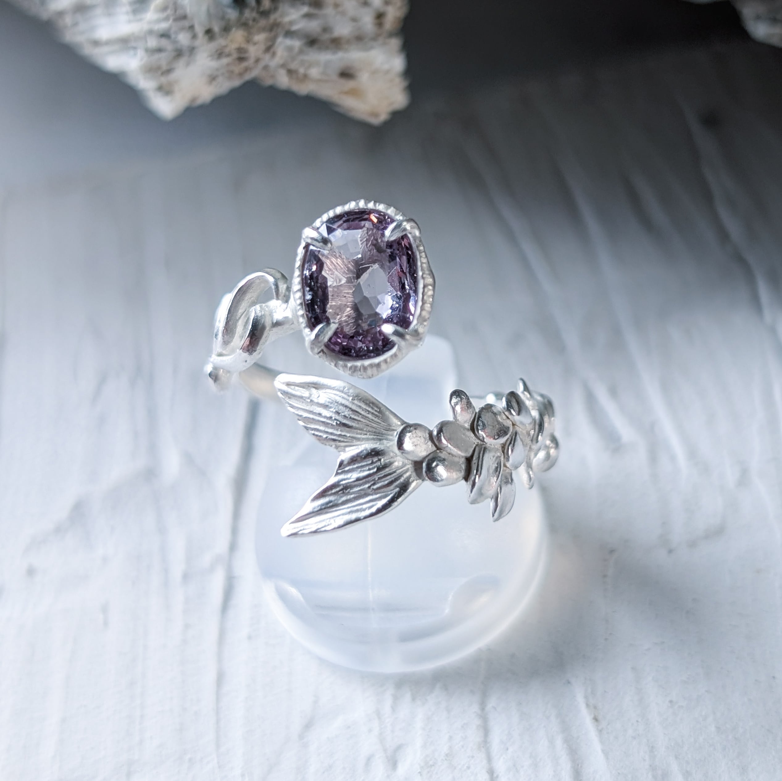 淡い紫色のスピネルを留めた、人魚の指環。