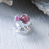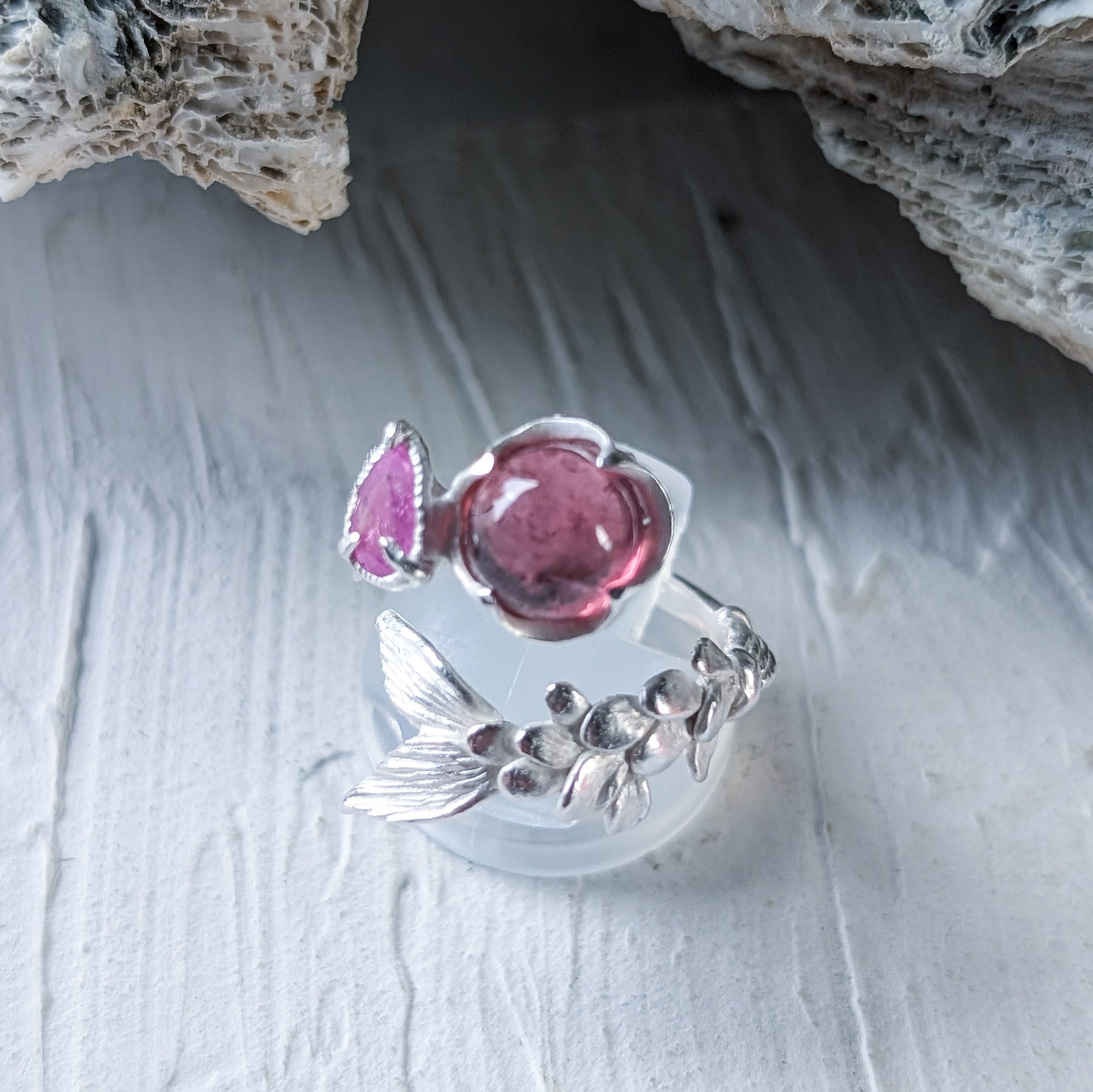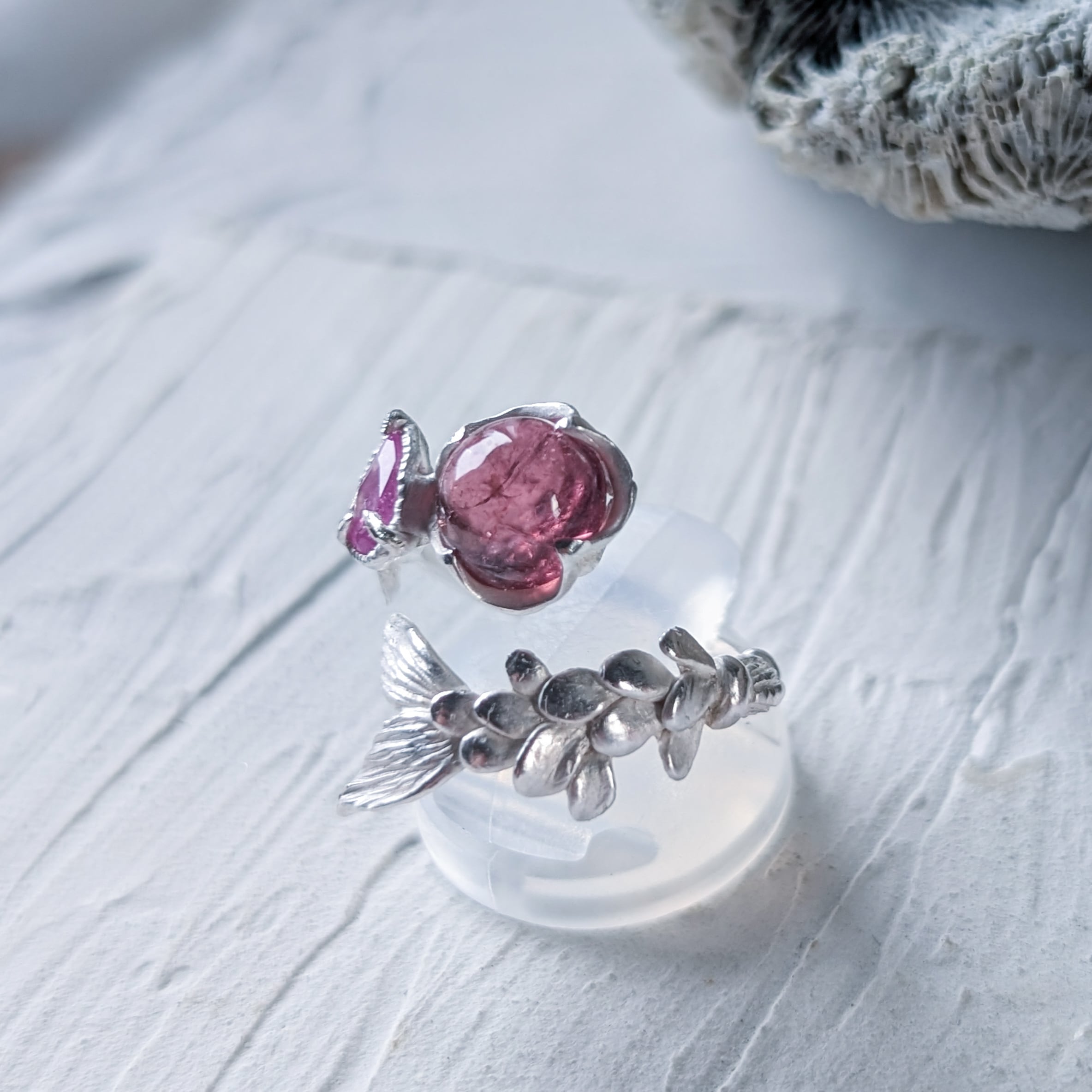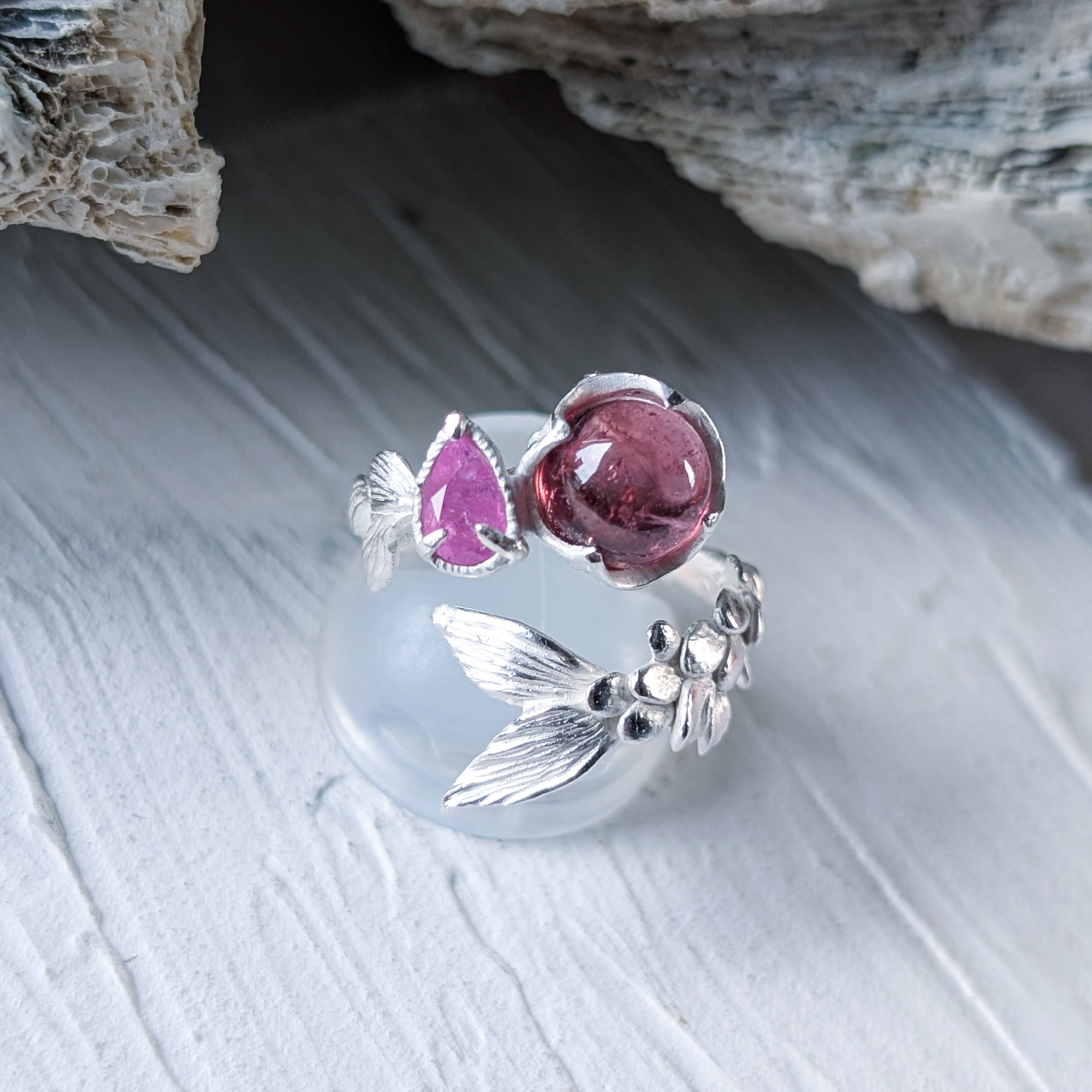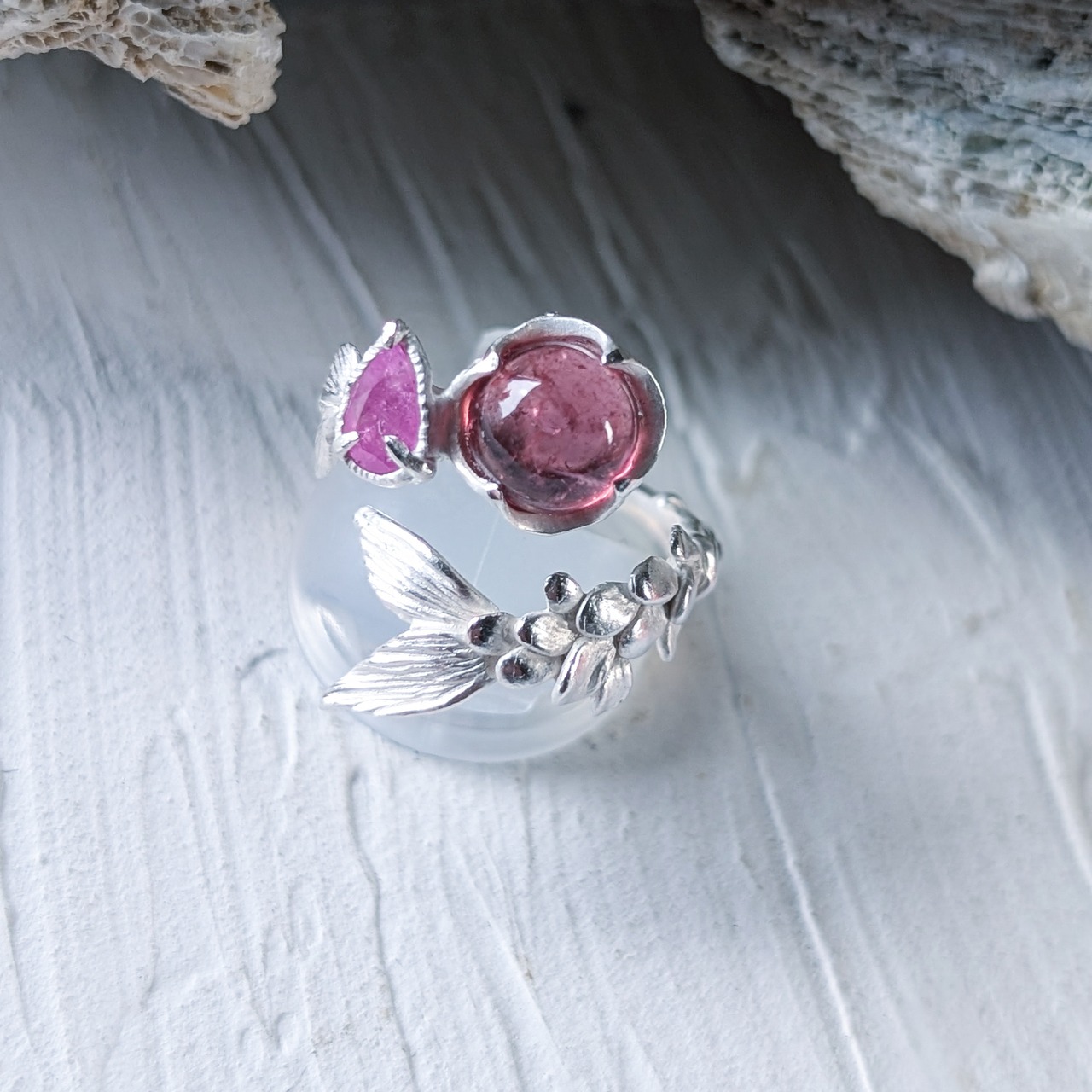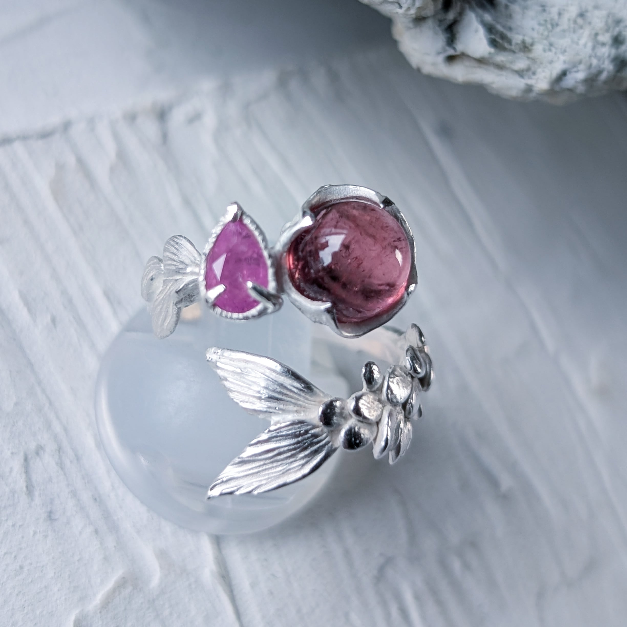 ルベライトとシルキーサファイアを留めた指環。