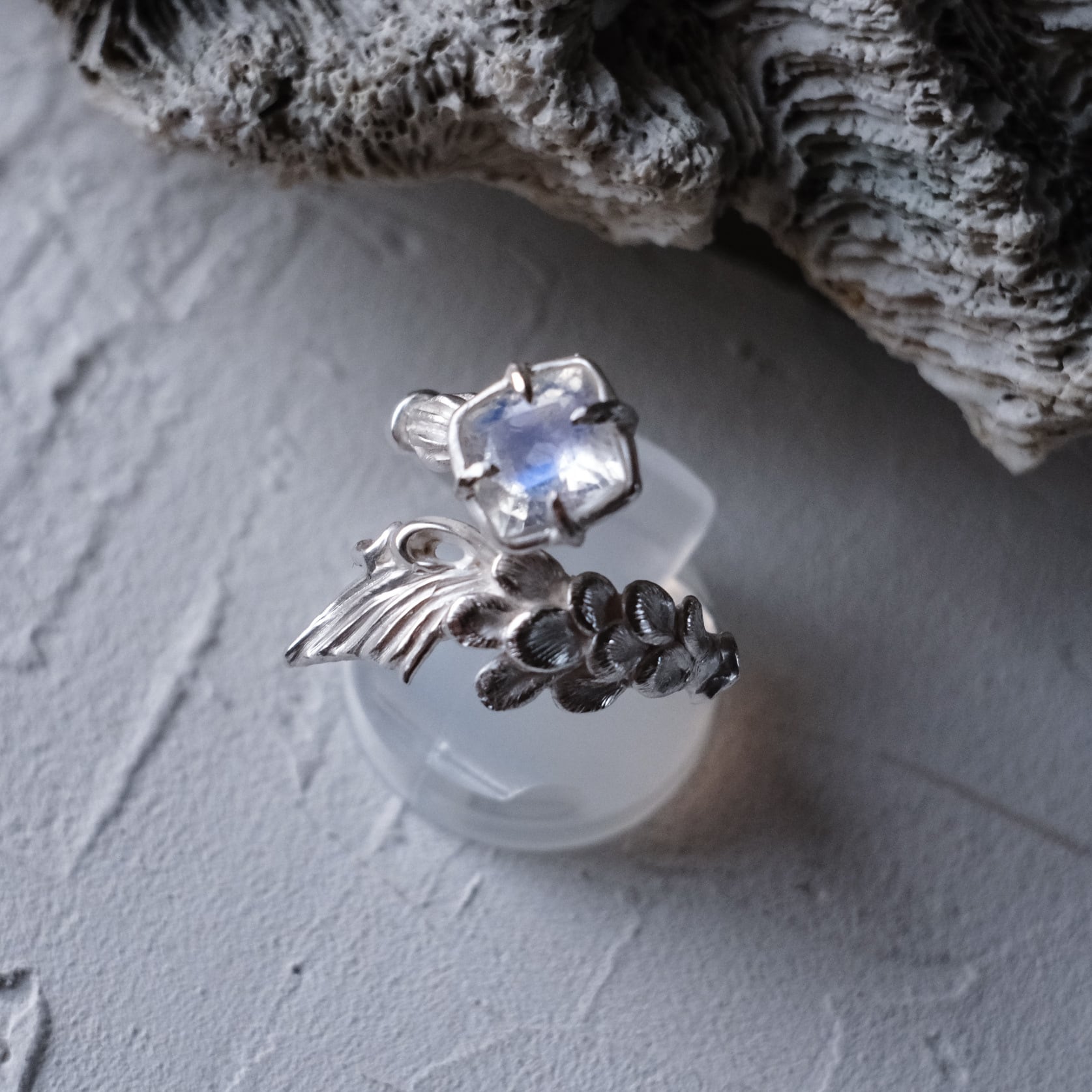 淡い月の光のようなシラーが見られるブルームーンストーンを留めた指環。