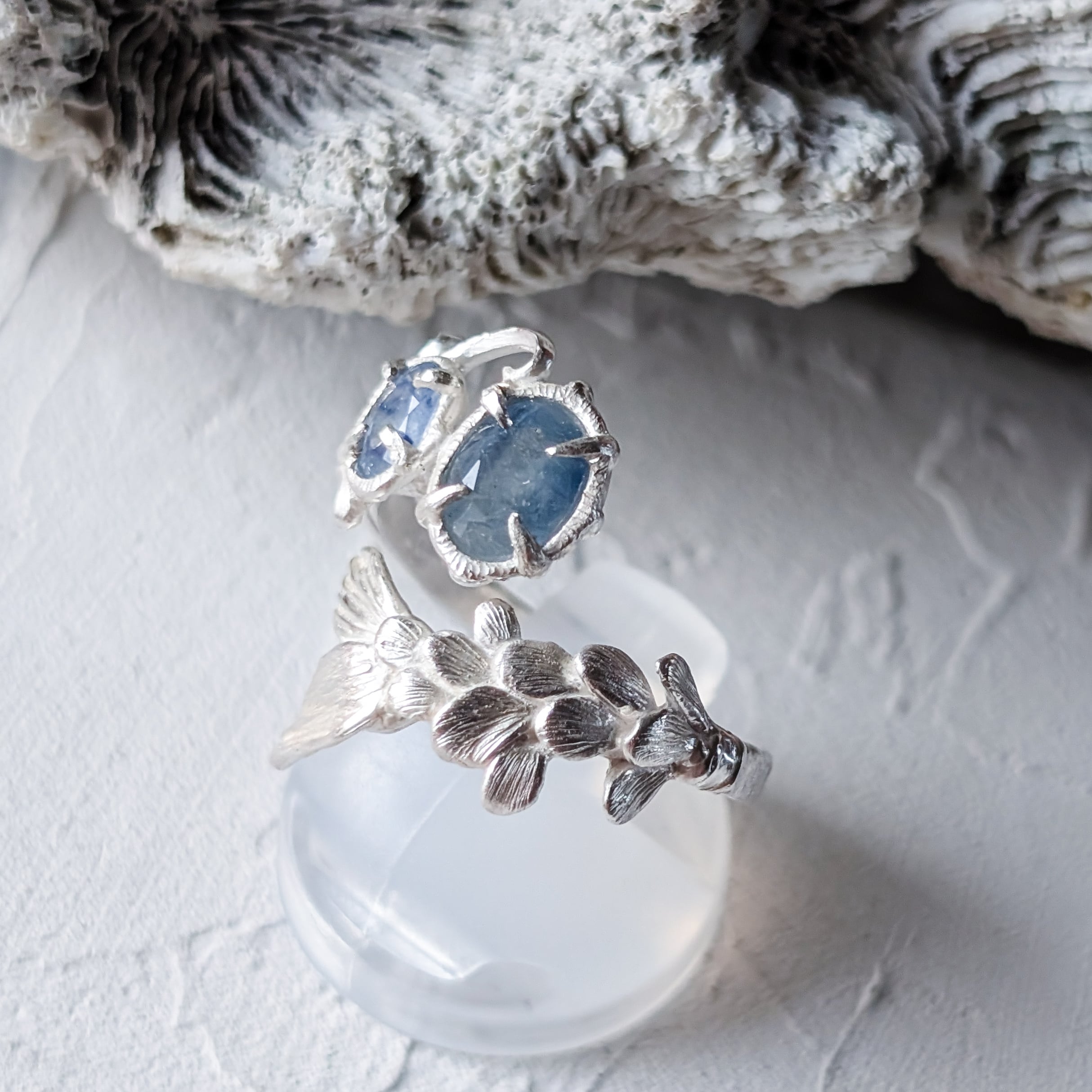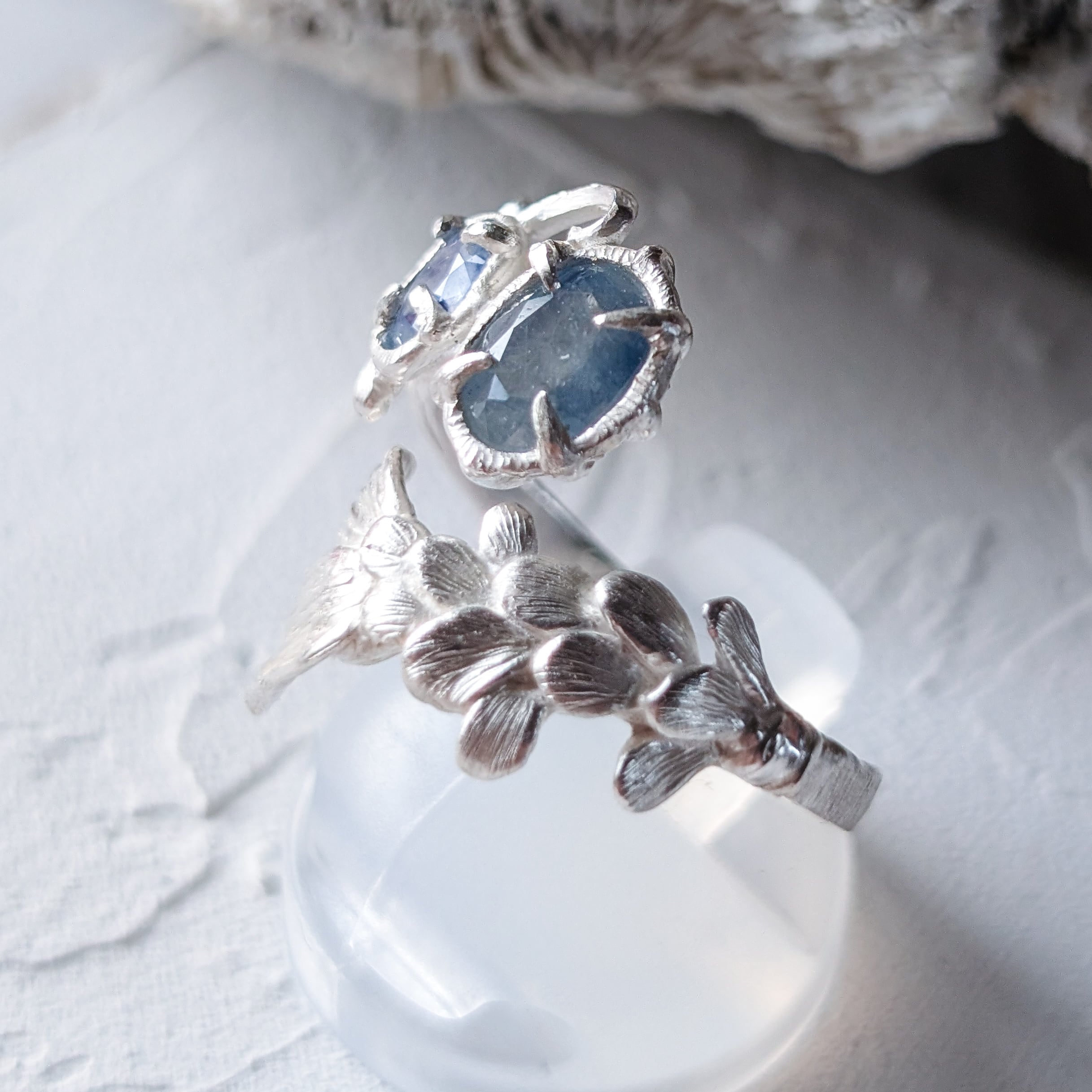 いつか見た海の色を思わせる、バイカラーサファイアを留めた指環。